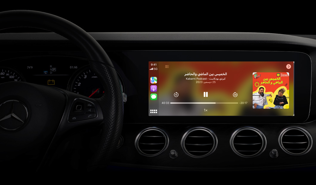 مع كاربلاي، يمكنك بكل سلاسة الاستماع إلى المحتوى الصوتي من جهازك iPhone أثناء القيادة واستخدام عناصر التحكم المدمجة في السيارة.2 وتستطيع أيضاً أن تطلب من Siri تشغيل أحدث حلقة أو التحكم في التشغيل. ويأتي تطبيق Apple Podcasts مثبتاً مسبقاً في موديلات مختارة من السيارات.