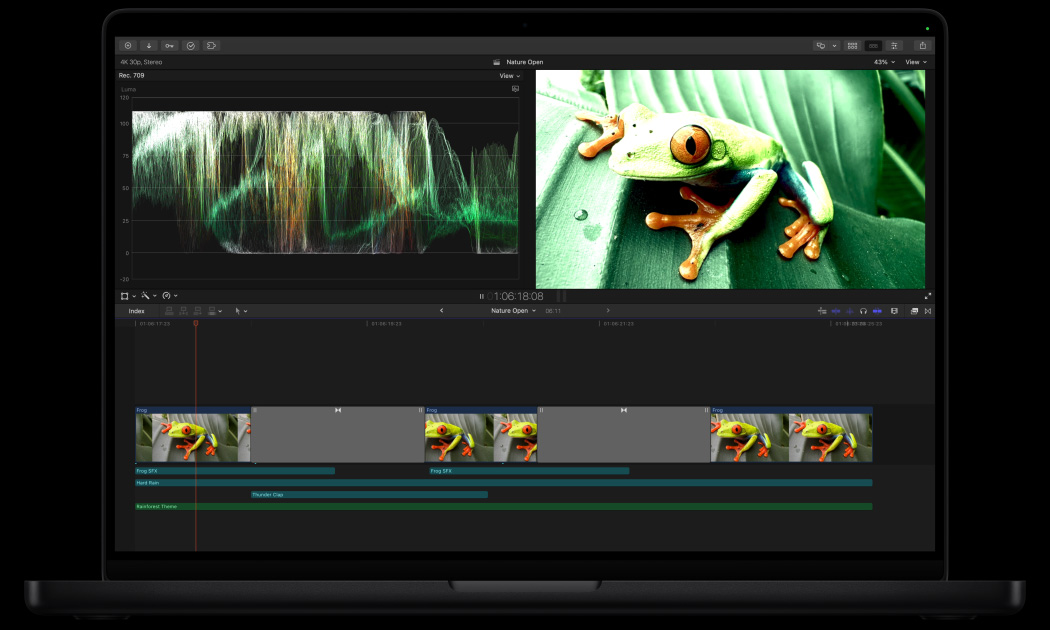 No need to switch apps. Final Cut Pro includes a range of powerful audio plug-ins from Logic Pro, along with third-party audio plug‑ins.5