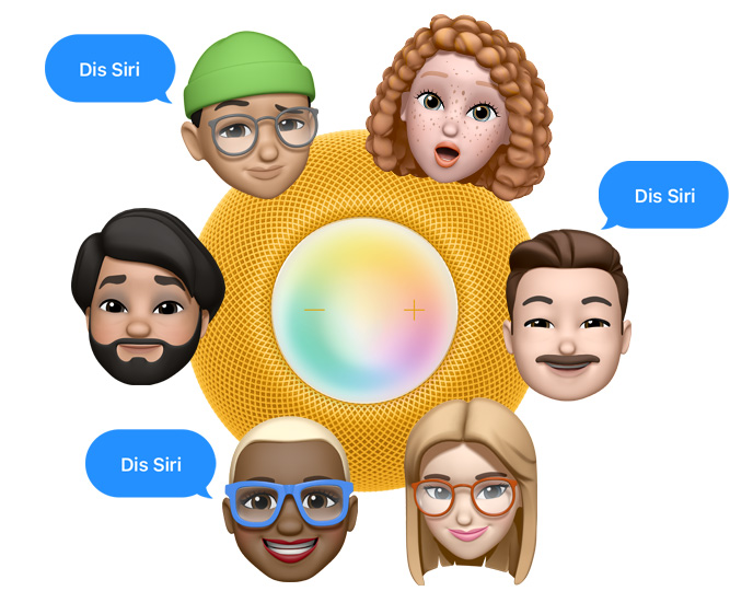 Six Memoji de personnes encerclent une vue en plongée d’un HomePod mini jaune. Trois des personnes disent « Dis Siri » dans des phylactères bleus.