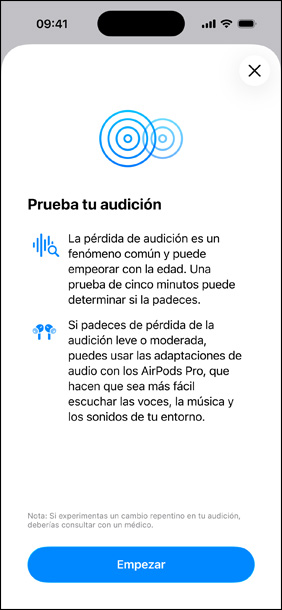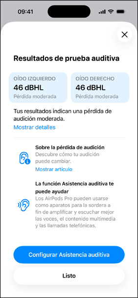 Una diferencia significativa. Cuando termines la prueba, si se determina que tienes pérdida auditiva leve a moderada, tu perfil auditivo personalizado te guiará hasta la funcionalidad Asistencia Auditiva. Con una rápida configuración, de inmediato comenzarás a escuchar con más claridad. Incluso puedes personalizarla según lo que necesites.