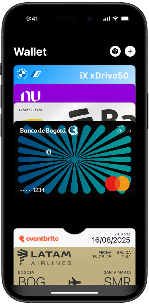 La app Wallet está en tu iPhone para que puedas guardar de forma segura y en un solo lugar tus tarjetas de crédito y débito, pases de abordar, boletas y más. Además, funciona con el iPhone y el Apple Watch, para que tengas a la mano muchas más cosas, llevando encima