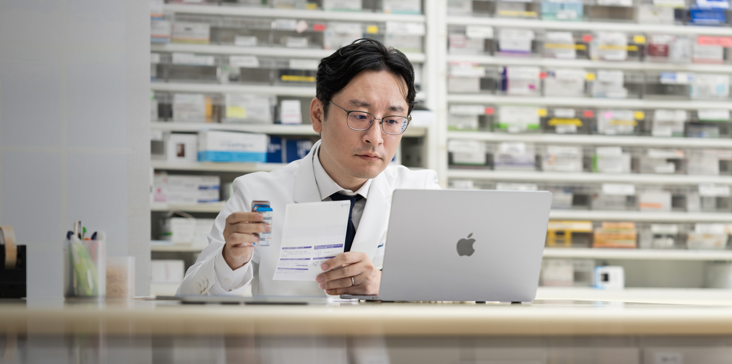 Damit die Nagomi Pharmacy dauerhaft zu einer wichtigen Stütze der Gemeinde werden konnte, brauchten Watanabes Apotheker:innen ausreichend Zeit, um auf ihre Kund:innen eingehen zu können. Dazu mussten die Abläufe optimiert und der Zeitaufwand für Verwaltungsaufgaben reduziert werden. Zu diesem Zweck nutzte Watanabe die Technologie von Apple, um ein digitalisiertes Bestands‑ und Auftragsverwaltungssystem für sein Team aufzubauen.
