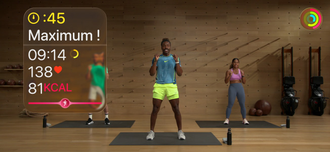 App Apple Fitness+ sur un iPhone affichant un exercice avec des données d’entraînement synchronisées sur une Apple Watch