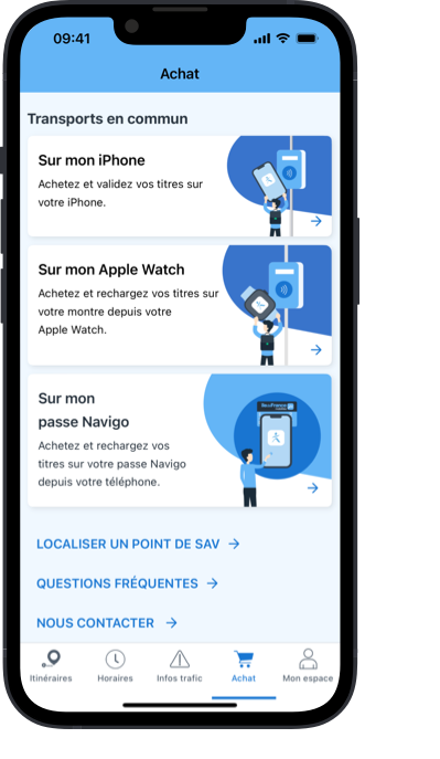 Vous pouvez utiliser votre Navigo sur un iPhone Xs (ou modèle ultérieur) mis à jour vers iOS 17.5, et sur une Apple Watch Series 6 (ou modèle ultérieur) dotée de watchOS 10.5.
