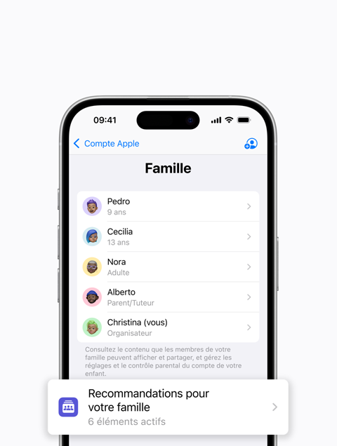 Découvrez nos conseils et nos idées d’utilisation des fonctionnalités familiales. Ouvrez Réglages, touchez votre nom, Famille, puis Recommandations pour votre famille.