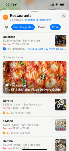 Choisissez une destination, et sa fiche interactive vous montre tout ce dont vous avez besoin d’un simple coup d’œil. Consultez des renseignements comme l’adresse, les horaires d’ouverture, le site web et le numéro de téléphone, mais aussi des informations sur la gamme de prix, des galeries de photos, les guides de ville associés et les types de paiements acceptés. Vous pouvez même vérifier si votre chien est le bienvenu. Lancez Flyover pour vous faire une idée du lieu et des alentours. Vous pouvez également louer un vélo, payer un parcmètre ou encore commander à manger d’un simple geste. C’est rapide, et parfaitement sécurisé.