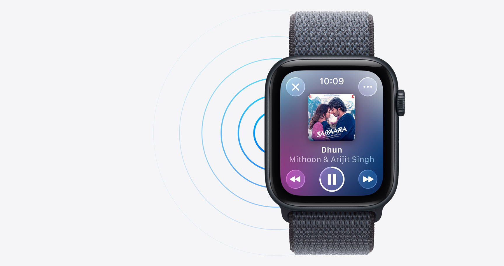 SE 3 connects seamlessly to your AirPods so you can listen to music or podcasts hands-free.6 And if you don’t have your AirPods nearby, you can now play media through the watch speaker.