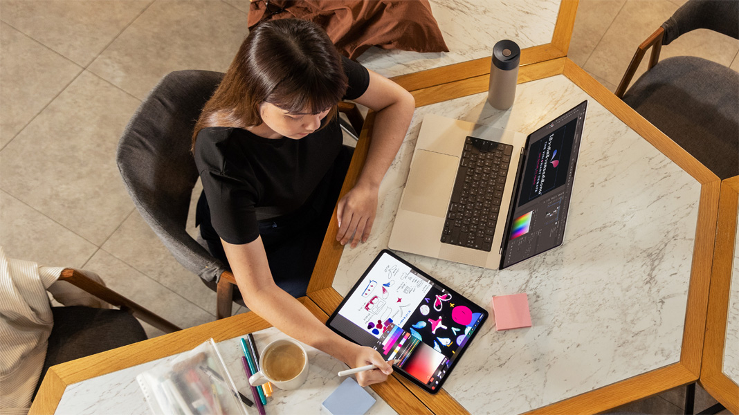 Ideas come to her in parks, coffee shops — anywhere and at any moment, Suwara says. Voice Memos on iPhone help her capture her thoughts. Later, she sketches out her ideas with Apple Pencil on iPad and creates final compositions using Adobe Creative Suite on MacBook.