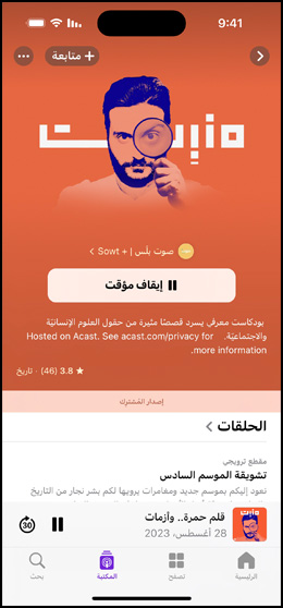 استكشف مجموعة رائعة ومتنوعة من حلقات البودكاست الممتعة والغنية بالمعلومات. تعمّق في كل ما يثير اهتمامك، بدءاً بالمقابلات الملهمة وصولاً إلى المسلسلات المهمة. استمتع بكل ذلك على منصة مصممة خصيصاً للمستمعين والمبتكرين المبدعين.