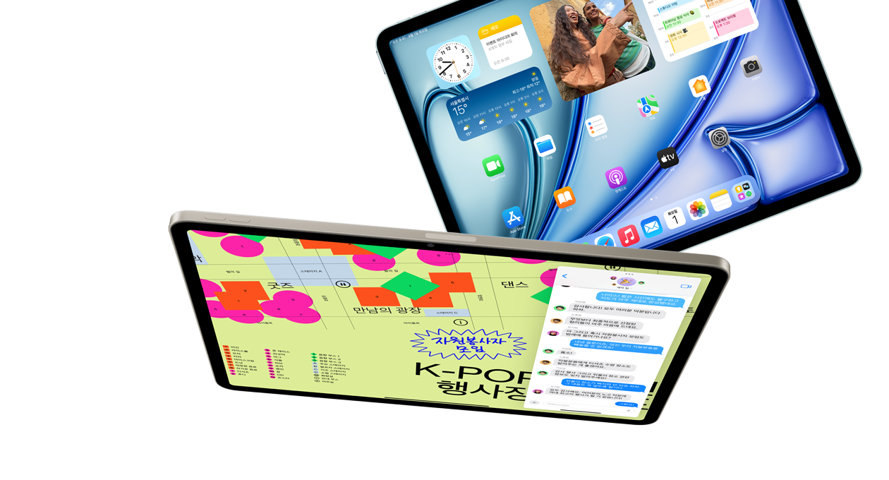 iPad Air를 11 모델 또는 13 모델 중에서 선택할 수 있습니다. 어느 쪽을 택하든 아름다운 고해상도 Liquid Retina 디스플레이가 당신이 즐겨 하는 모든 것에 생생함을 더해주죠. 두 디스플레이 모두 선명한 색감, 뛰어난 반응성 그리고 정확한 색상 처리로 몰입감 넘치는 시각 경험을 선사합니다.