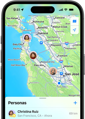 Encuentra fácilmente a amigos y familiares para mantenerse conectados y que los niños estén siempre protegidos. Puedes usar la pestaña Personas para invitar a tus amigos a compartir su ubicación o recibir alertas de ubicación automáticas, por ejemplo, cuando tu hijo sale de la escuela. Los padres incluso pueden controlar la manera en que sus hijos comparten la ubicación.