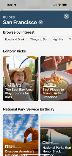 Guides help you find amazing things to see and do in cities around the world.6 Just tap the Explore Guides button to access nearly 1000 expertly curated Guides, and find and save the ones that catch your eye. Curated Guides automatically update when new places are added, so you always have the latest recommendations at your fingertips. You can also create your own Guides and share them with friends and family.