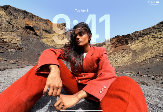 探索 iPad iPad Pro 和 iPad Air 並排展示,直向放置的 iPad Air 一部份疊在 iPad Pro 上方,鎖定畫面以 Liquid Glass 的風格,通透地顯示時間
