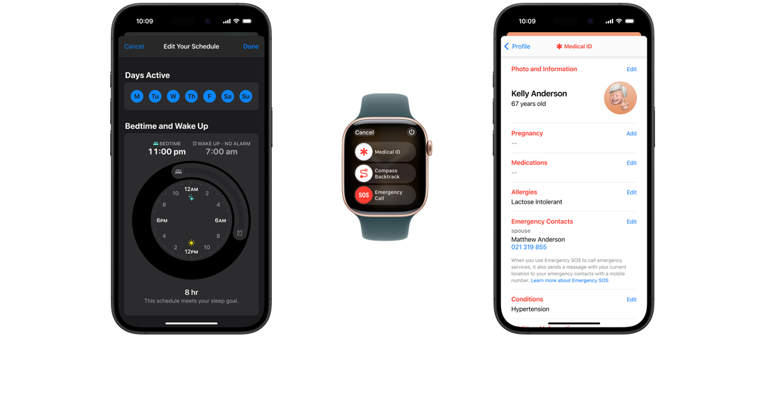 On iPhone and Apple Watch, emergency personnel can quickly access a Medical ID with important information like allergies, blood type, emergency contacts and more.