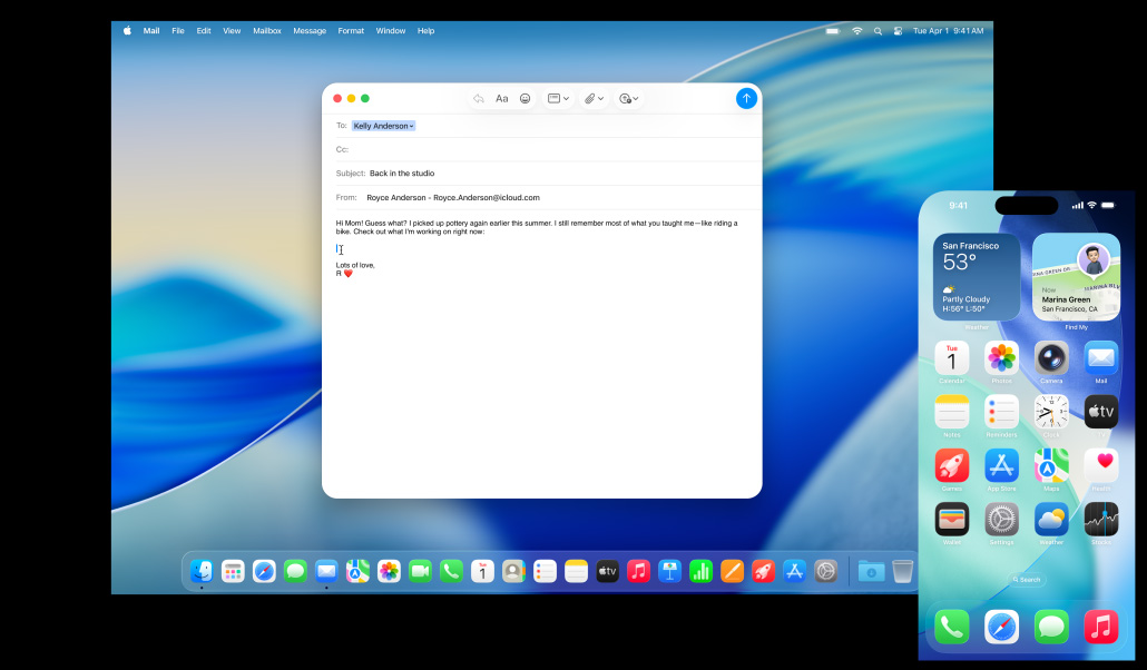 iPhone Mirroring lets you see and use your iPhone from your Mac.5 So even if your phone is charging across the room, you can still access all your favourite iPhone apps. You can even drag and drop a video from your iPhone Photos app straight onto your Mac desktop. Live Activities from your iPhone also appear on your Mac. So when timely events occur, you don’t have to reach for your phone to stay in the know.