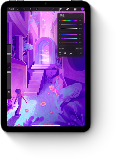 使用者手握 Apple Pencil Pro,在 iPad mini 上創作出多彩的插圖。