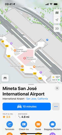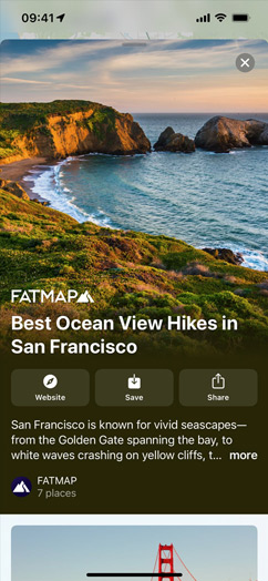 Choose a destination, and its interactive place card shows you everything you need at a glance. See basics like address, opening hours, website and phone number, along with details like price range, photo galleries, associated Guides, accepted payment types — even whether you can take your dog. Launch Flyover or Look Around to get a sense of the location and surroundings. You can even quickly and securely rent a bike, pay for parking, order food and more with just a tap.