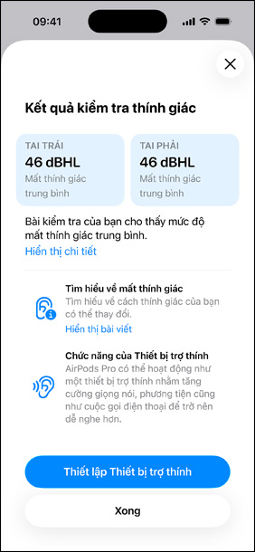 Nhận kết quả ngay. Tiếp cận hỗ trợ tức thì. Khi hoàn tất bài kiểm tra, bạn sẽ thấy một hồ sơ được cá nhân hóa kèm các kết quả dễ hiểu và thông tin chuyên sâu về khả năng nghe của bạn. Nếu bạn mất thính giác nhẹ hoặc không gặp vấn đề gì, nhưng vẫn cần nghe một số tần số rõ ràng hơn, bạn có thể điều chỉnh cài đặt Hỗ Trợ Phương Tiện để cải thiện âm thanh cho nội dung phát và cuộc gọi. Và nếu bạn có tình trạng mất thính giác từ mức nhẹ đến trung bình, bạn sẽ được nhắc thiết lập tính năng Thiết Bị Trợ Thính.