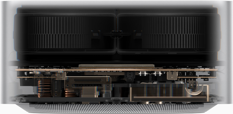Within the 19.7-centimetre-square Mac Studio enclosure lies a thermal system designed to let M4 Max or M3 Ultra fly through intensive tasks at lightning-fast speeds. Even with so much incredible power, Mac Studio stays quiet, so it never interferes with your workflow.